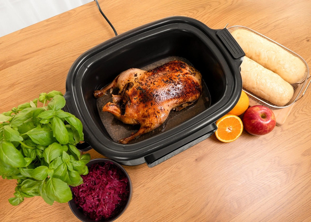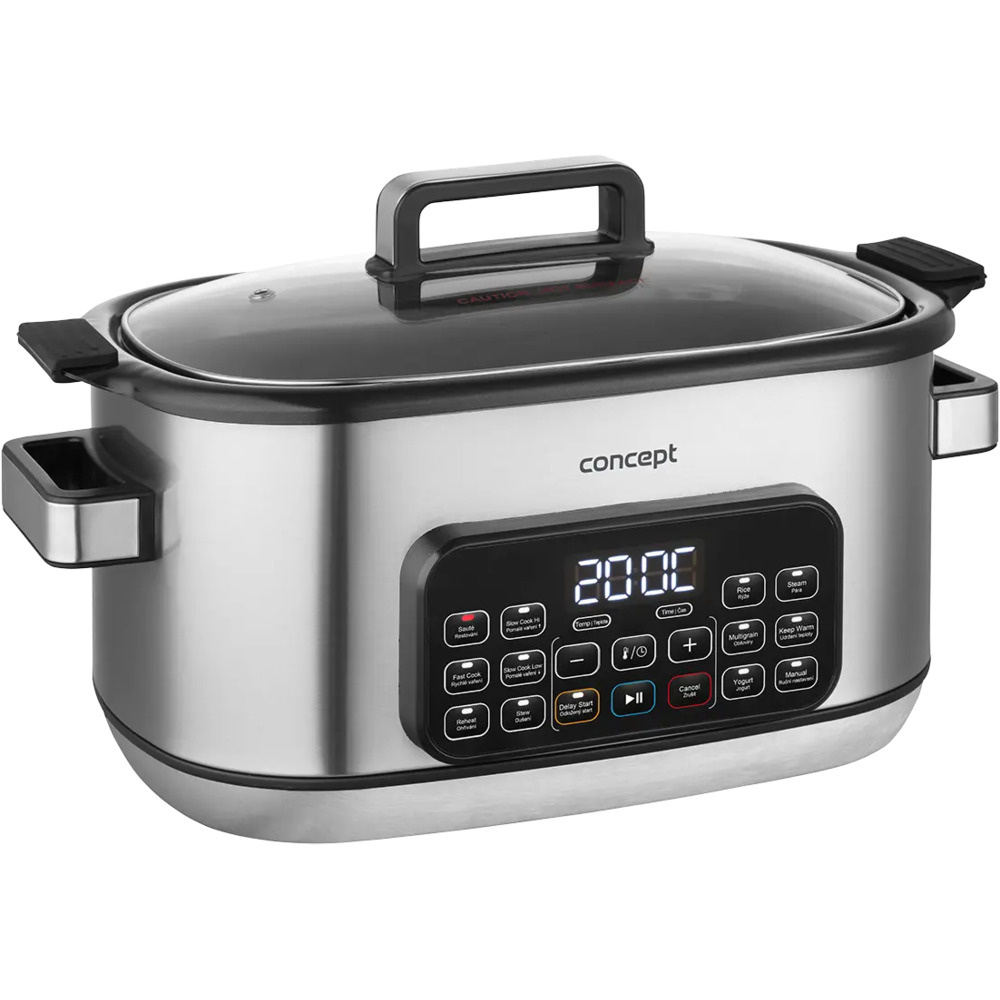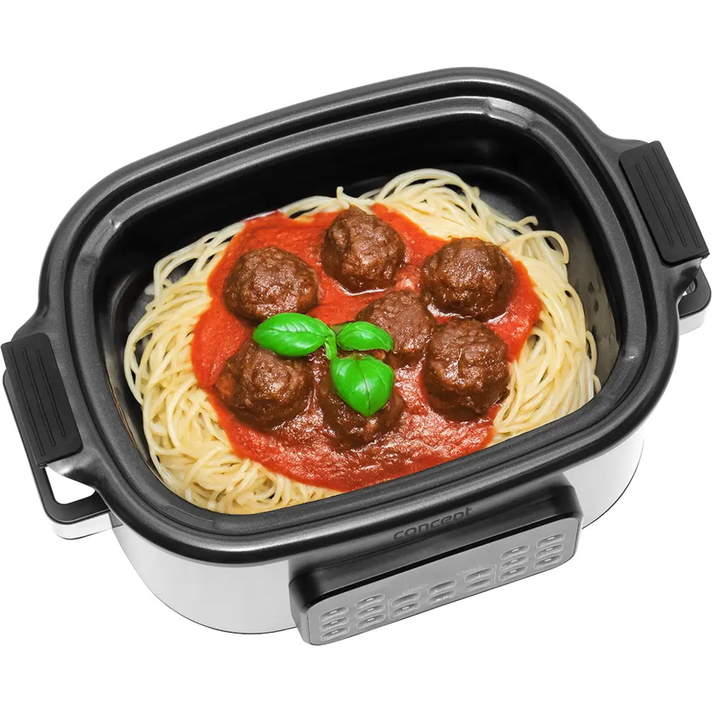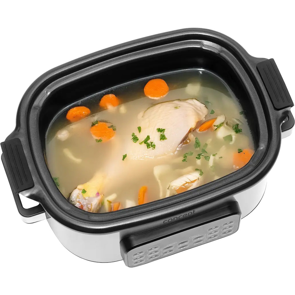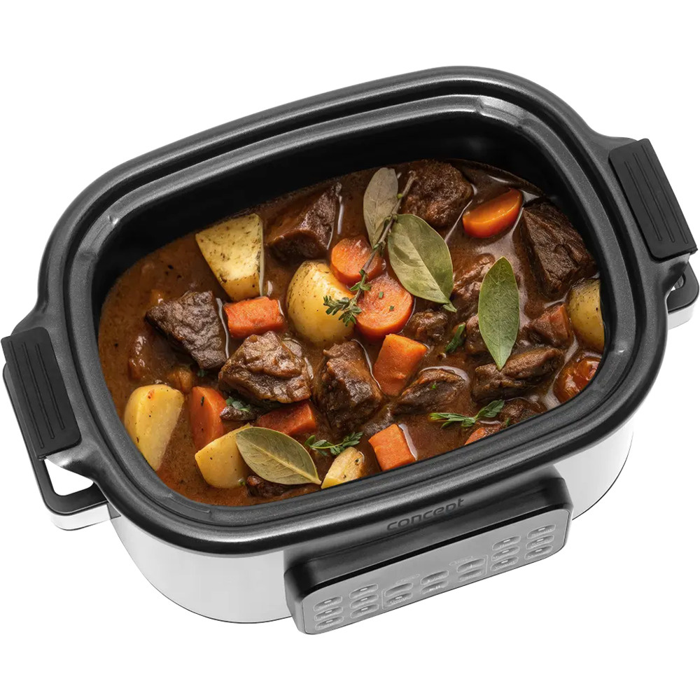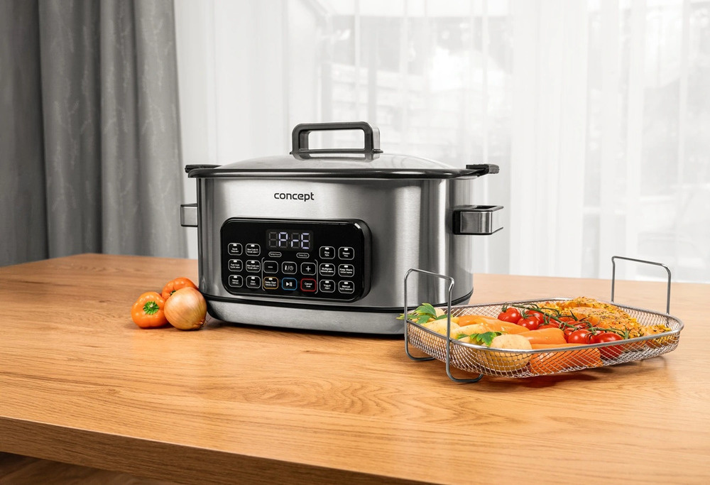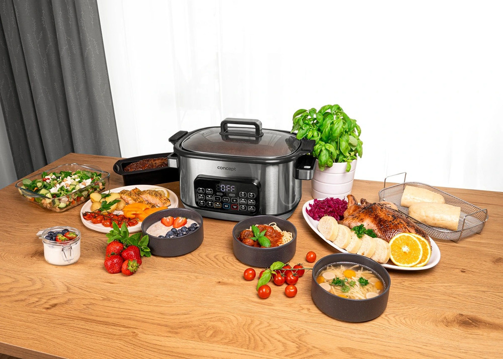 Der Concept CK9000 Multifunktions-Slow Cooker ist ein praktischer Helfer, der Zeit, Energie und Platz auf der Küchentheke spart. Er bietet 10 Automatikprogramme, darunter langsames Garen und Dampfgaren, so dass er eine Vielzahl von Gerichten problemlos bewältigen kann. Der Deckel aus gehärtetem Glas ermöglicht eine bequeme Kontrolle des Kochvorgangs, ohne dass er geöffnet werden muss. Dank seiner kompakten Größe ist der Kocher leicht zu transportieren - ideal für das Ferienhaus oder den Urlaub. Ein Mini-Kochbuch mit Rezepten ist im Lieferumfang enthalten und erleichtert den Einstieg.
