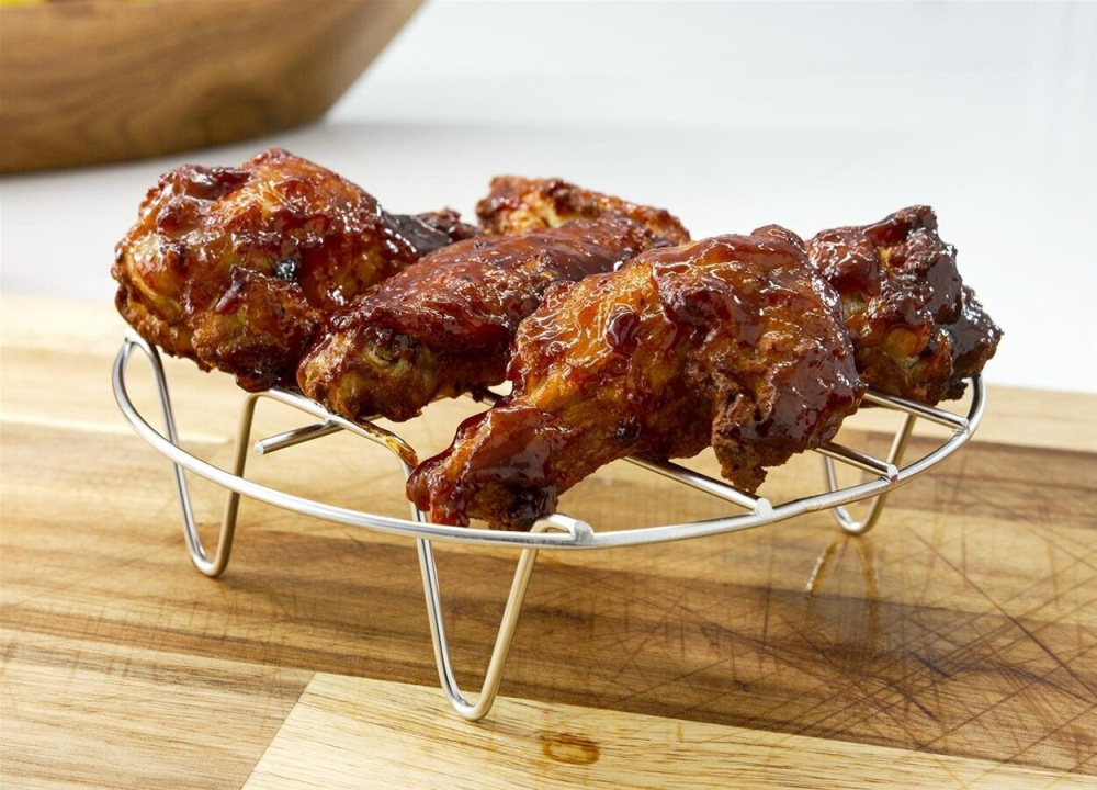 Im Cosori Heißluftfritteusen-Zubehörset finden Sie auch ein Edelstahlgestell, das Sie vor allem bei der Zubereitung von Fleisch, Fisch oder Spießen verwenden können. Das Gestell lässt die heiße Luft von der Unterseite strömen, so dass das Ergebnis ein wirklich gleichmäßig gegartes Gericht ist.
