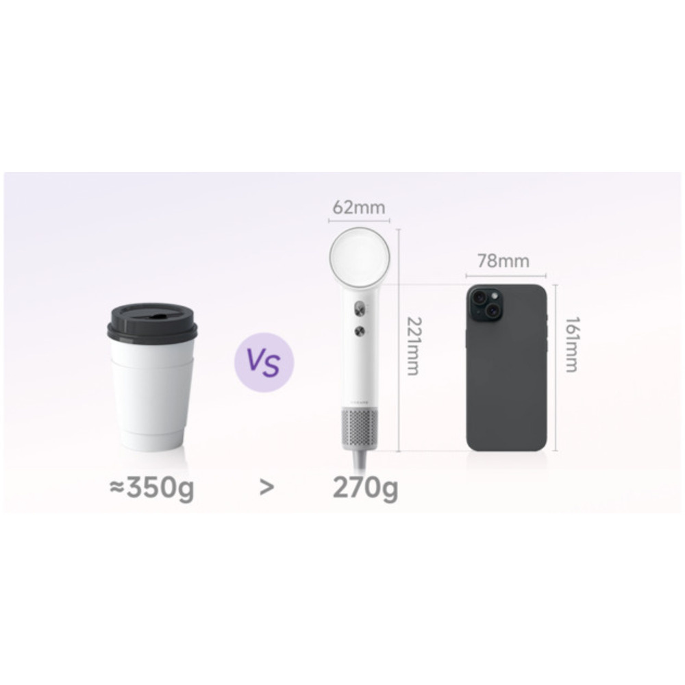 Das Herzstück des Dreame Hair Mini Dryer ist ein fortschrittlicher Hochgeschwindigkeitsmotor mit 100.000 U/min. Er erzeugt einen starken Luftstrom von bis zu 70 m/s bei hoher Geschwindigkeit und 55 m/s bei niedriger Geschwindigkeit. Dabei wiegt das Gerät nur 270 Gramm und hat einen Durchmesser von nur 62 Millimetern, was eine komfortable Handhabung und ein präzises Styling gewährleistet.