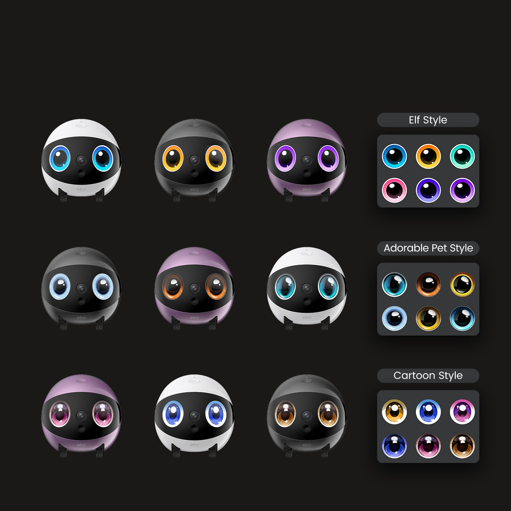 Zwei digitale Anzeigen der Austausch der Augen verleiht dem EBO Air 2 Plus Persönlichkeit und Emotionen. Benutzer können einstellen farbe, Stil und Animationum das Aussehen des Roboters an Ihre Stimmung oder Umgebung anzupassen. Die Augen reagieren auf verschiedene Situationen - z. B. beim Sprechen, Aufladen oder Bewegen - um einen lebendigen, freundlichen Eindruck zu vermitteln.