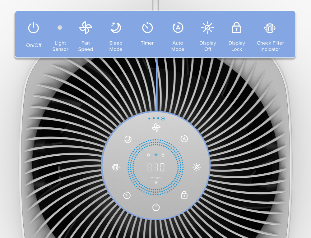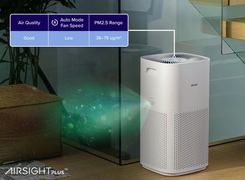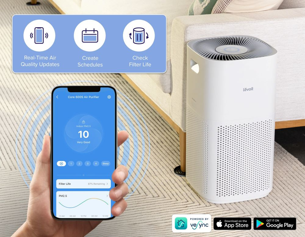 Die Luft wird in drei Schichten gereinigt, beginnend mit einem Außenfilter aus Nylon, der die gröbsten Partikel wie Staub, Fasern, Haare oder Haarteilchen auffängt. Die zweite Schicht ist ein HEPA-Filter mit der ARC™-Formel, mit der sich Levoit durch eine wesentlich höhere Qualität und Zuverlässigkeit von der Konkurrenz abhebt. Hier werden Feinstaubpartikel, Schimmel, Bakterien, Pollen, Rauchpartikel, Staubmilben und Haare herausgefiltert. Der letzte hocheffiziente Kohlefilter filtert Rauch, Gerüche, Abgase und andere kleinste Partikel heraus. Das System fängt bis zu 99,97 % aller Verunreinigungen bis zu einer Größe von 0,1 Mikrometern ab und ist für Allergiker und Asthmatiker zertifiziert. Sie können den Verschleißstatus des Filters direkt in der App auf Ihrem Smartphone oder Tablet überwachen.
