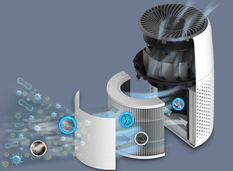 Der Reinigungsprozess beginnt mit einem Außenfilter aus Nylon, der gröbere Partikel wie Staub, Flusen oder Haare auffängt. Darauf folgt ein HEPA-Filter mit ARC™-Formel, der feine Staubpartikel, Schimmel, Bakterien, Pollen, Rauchpartikel, Staubmilben und Haare herausfiltert. Die letzte Schicht ist ein hochwirksamer Kohlefilter, der Rauch, Gerüche und Abgase beseitigt. Das Gerät fängt bis zu 99,97 % aller Verunreinigungen bis zu einer winzigen Größe von 0,3 Mikrometern ab.
