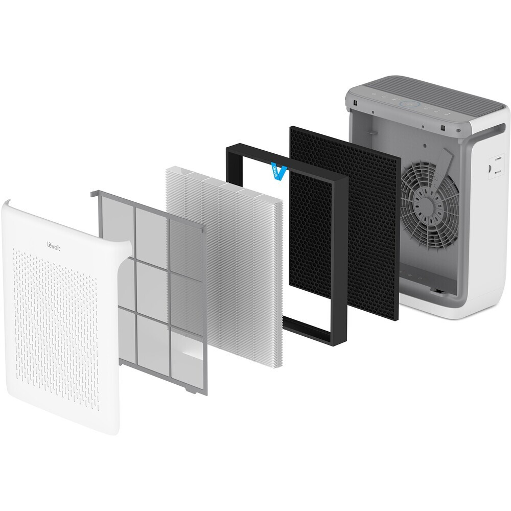 Die zweite Schicht ist ein HEPA-Filter. Dieser ist mit statisch geladenen Fasern ausgestattet, die mindestens 99,97 % der in der Luft befindlichen Partikel bis zu einer Größe von 0,3 Mikrometern auffangen, z. B. Feinstaub, Rauchpartikel, Schimmel, Bakterien, Pollen, Rauchpartikel, Hausstaubmilben und Tierhaare. Damit hebt sich Levoit von der Konkurrenz ab, denn HEPA-Filter sind wesentlich hochwertiger und zuverlässiger als herkömmliche Filter.