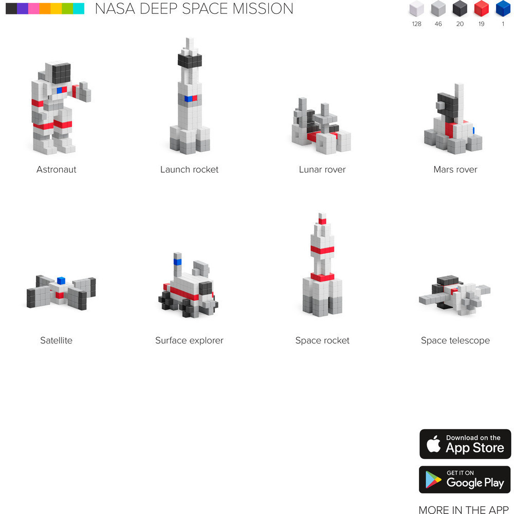 DESIGN SERIE PIXIO NASA-Weltraummission enthält 214 PIXIO-Blöcke in 6 Farben. Sie werden deine kreativen Ideen zum Leben erwecken und bunte Freude in dein Leben bringen. Beginne damit, einfache Modelle zu bauen, indem du die Anleitungen befolgst, und gehe dann dazu über, deine eigenen Designs zu entwerfen, wenn du bereit bist. Mit diesem Set kannst du einen Astronauten, einen Mondrover, eine Rakete, einen Satelliten, ein Teleskop und vieles mehr bauen. Pixio ist ein wahr gewordener Traum für pixel Art-Fans und Minecraft-Spieler. Verwenden Sie es als eine Lernressource für die Entwicklung der Kreativität von Kindern. Enthält 5 Farben, mit denen du einfache Formen in tolle Objekte und Figuren verwandeln kannst (weiß 128x, grau 46x, schwarz 20x, rot 19x, blau 1x).