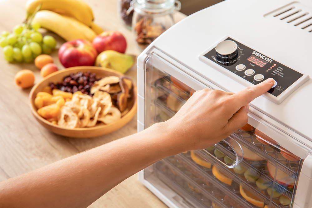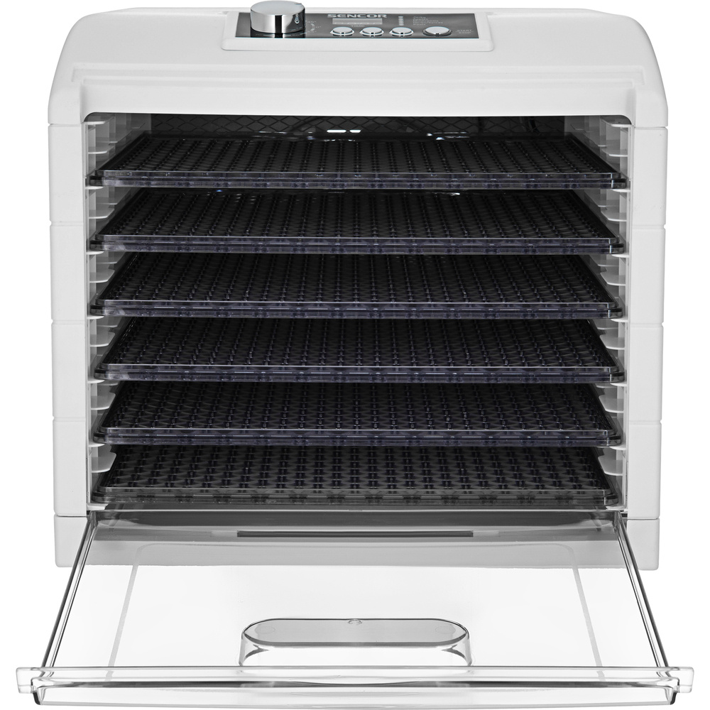 Der SENCOR SFD 6500WH bietet eine Trockenfläche von 0,59 m², das sind 33 % mehr als bei herkömmlichen Trocknern mit einem Durchmesser von 32 cm. Sechs herausnehmbare Kunststoffschalen ermöglichen es Ihnen, bis zu 3 kg Zutaten auf einmal zu verarbeiten (500 Goats pro Schale). Dank seiner kompakten Größe passt er in jede Küche.