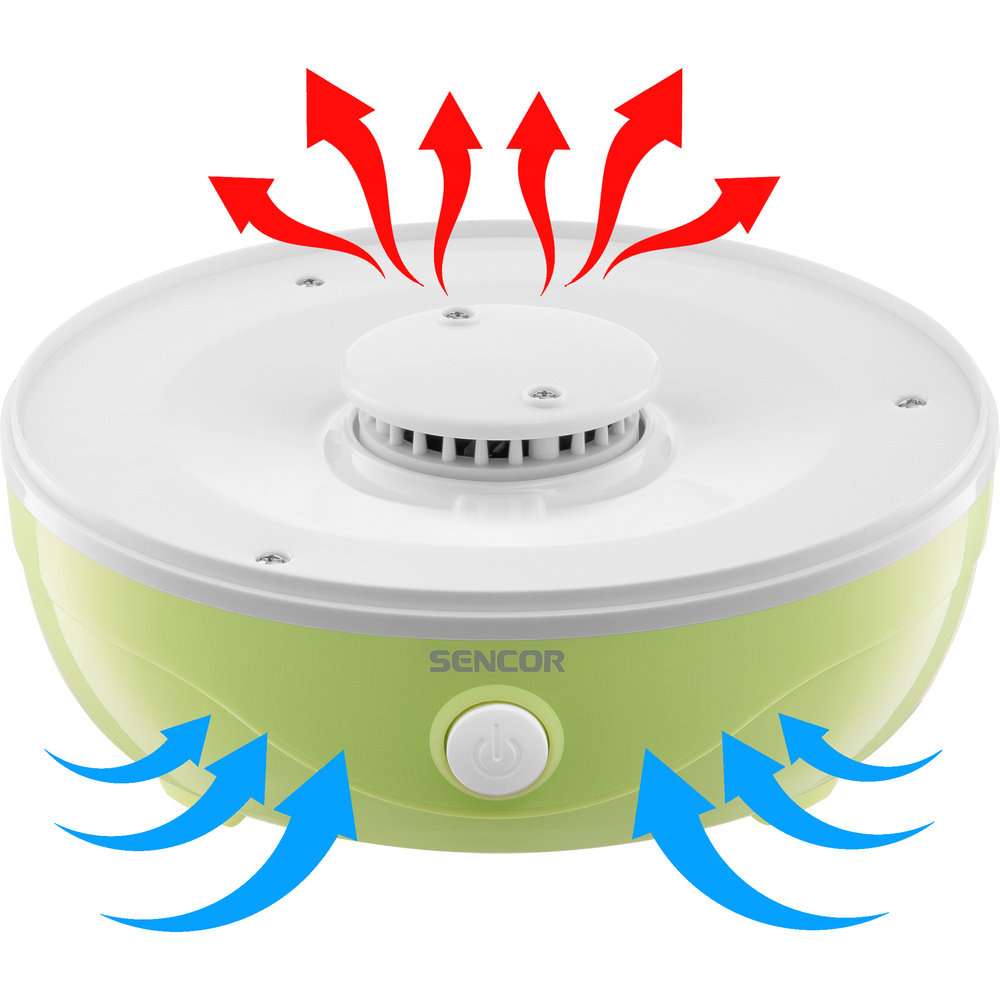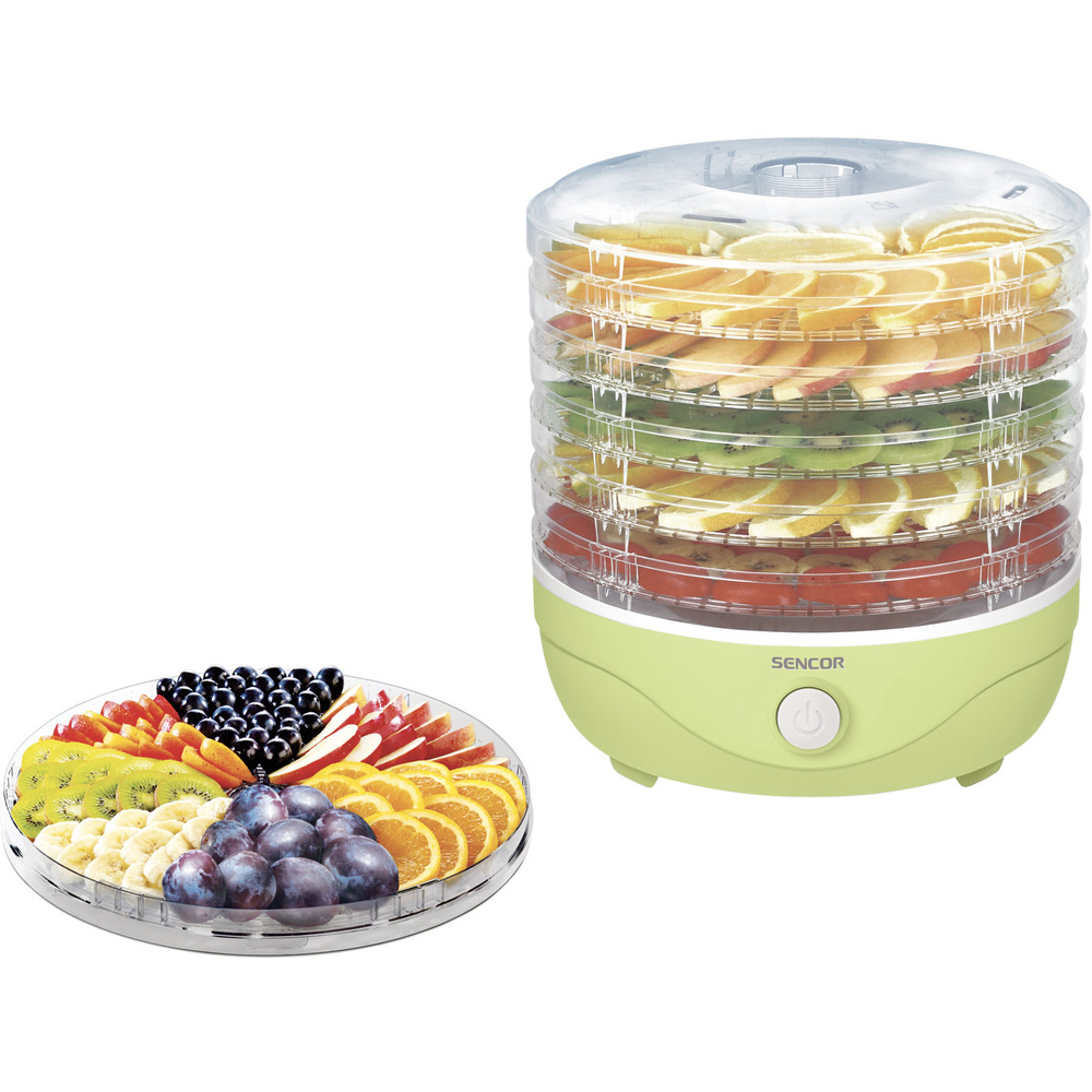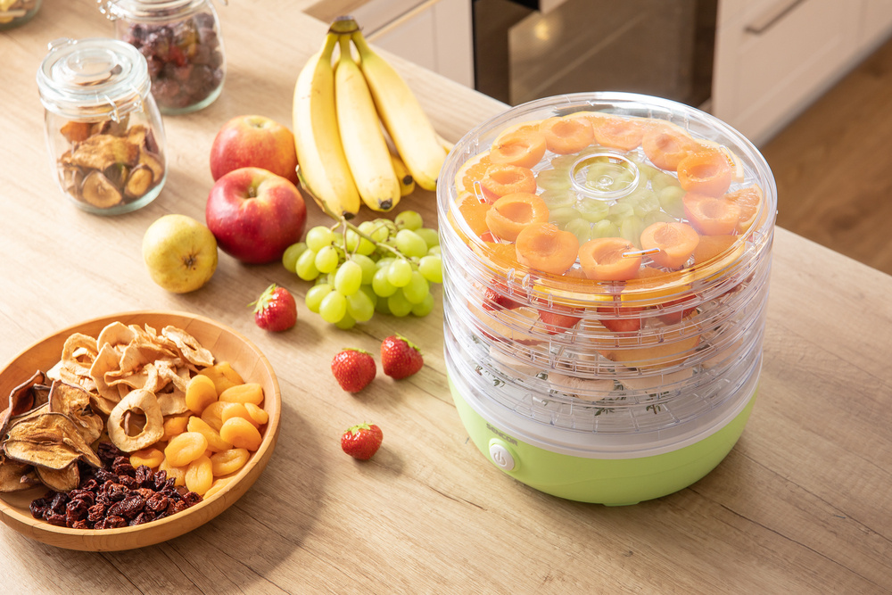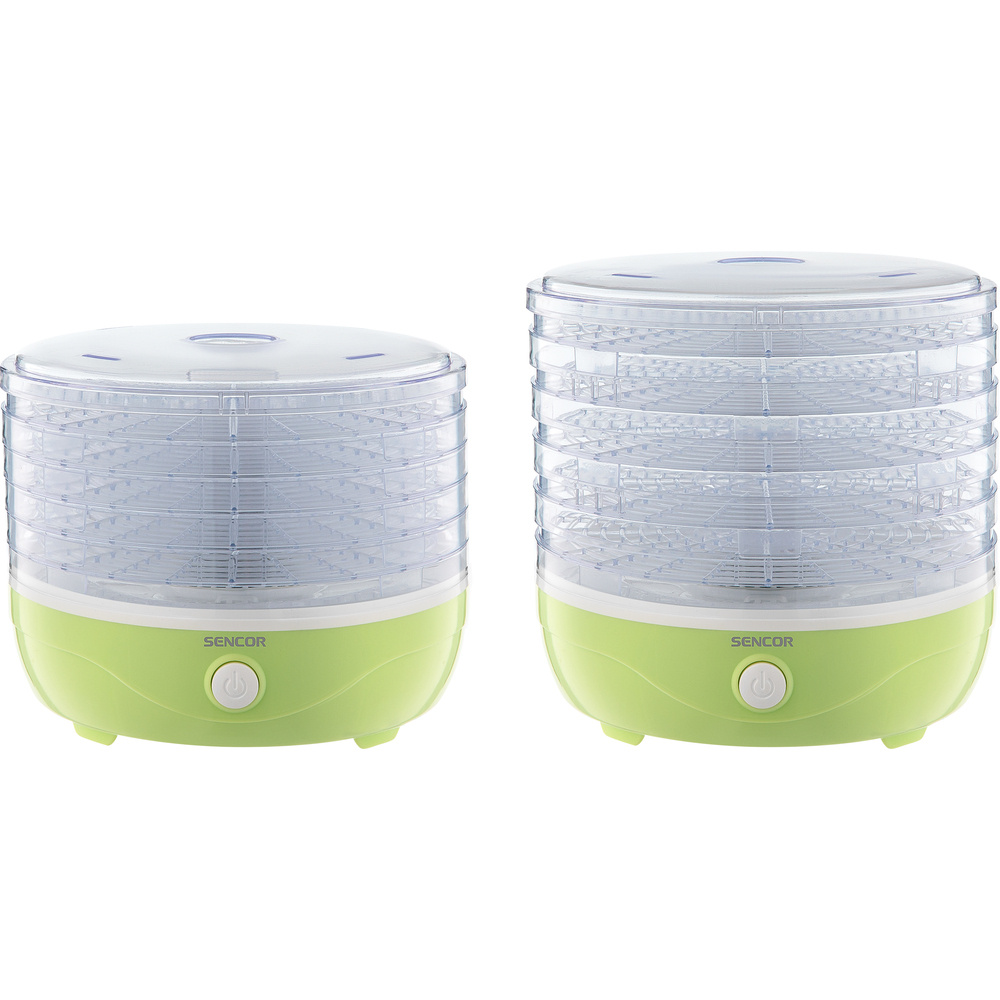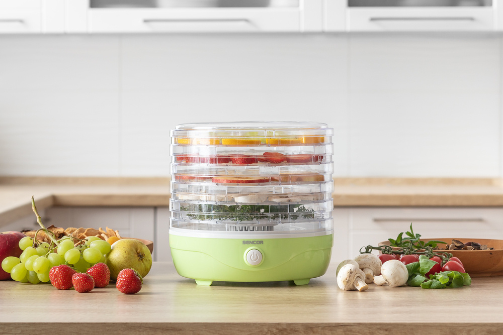 Der SENCOR SFD 757GG bietet fünf praktische Teller mit einem Durchmesser von 23 cm und einer verstellbaren Höhe von bis zu 2,5 cm. Dank der Möglichkeit, von nur einer Platte aus zu arbeiten, ist der Trockner sehr flexibel. Das eingebaute Gebläse sorgt für eine optimale Zirkulation der heißen Luft auf allen Etagen des Trockners, während das spezielle Design der Platten einen effizienten Luftstrom und eine gleichmäßige Trocknung aller Zutaten ermöglicht.