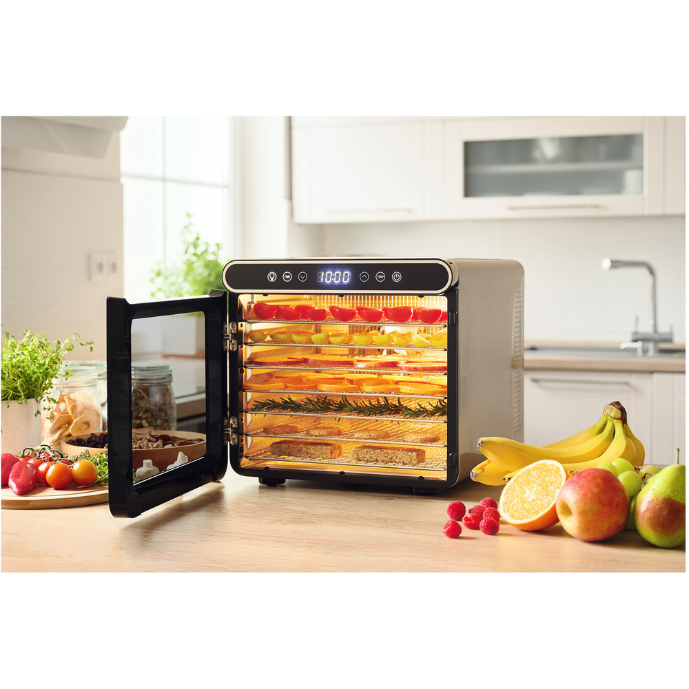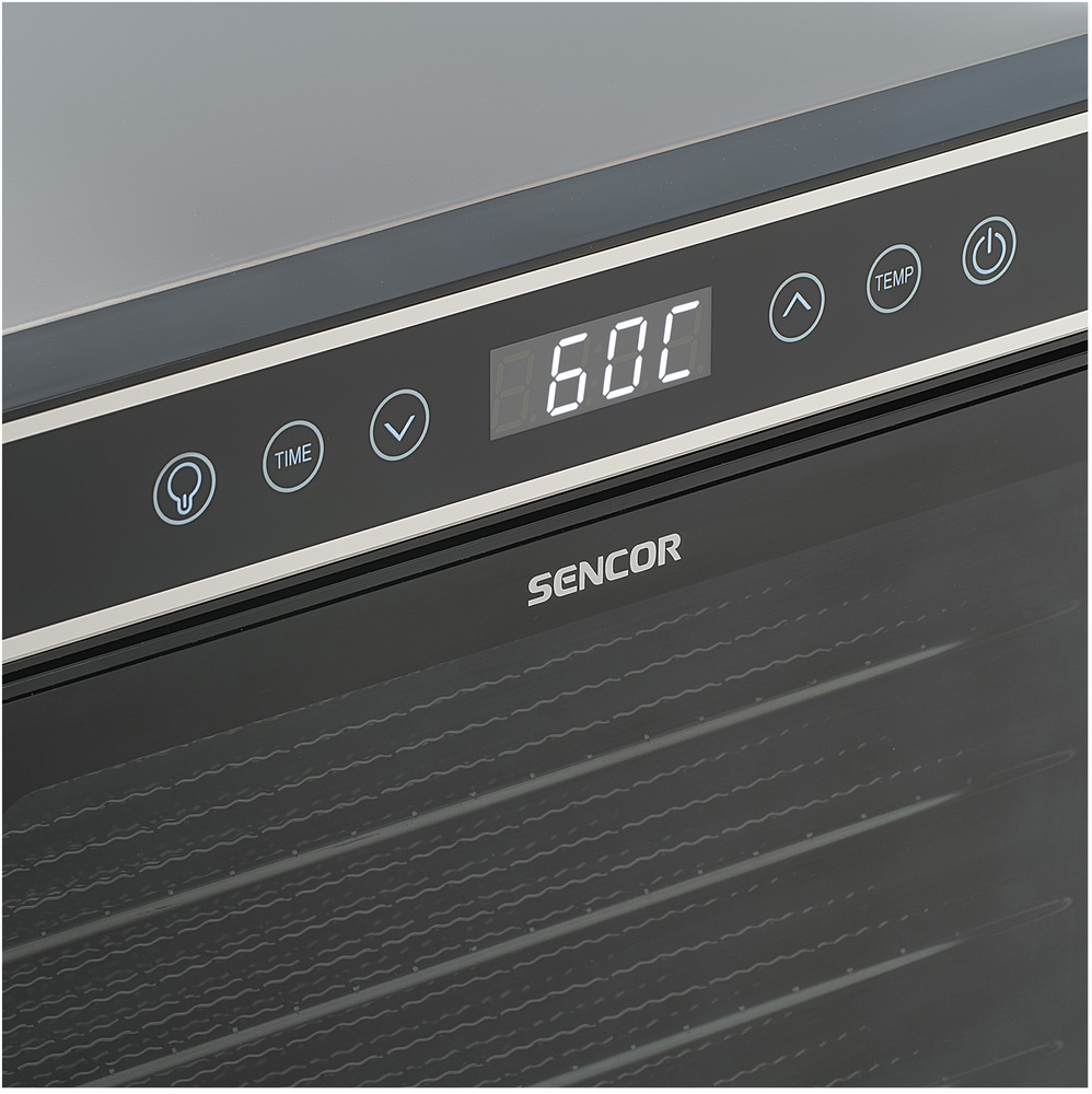 Das elektronische Bedienfeld mit LED-Anzeige ermöglicht eine Temperatureinstellung im Bereich von 35-70 °C. Der SFD 6601BK bietet ein breites Anwendungsspektrum - von der Zubereitung von Fruchtchips, getrockneten Kräutern, hausgemachtem Jerky bis hin zu RAW-Gerichten auf einem speziellen Vollblech. Dank der niedrigen Temperaturregelung ist er auch für die Zubereitung von Leckereien für Haustiere geeignet.