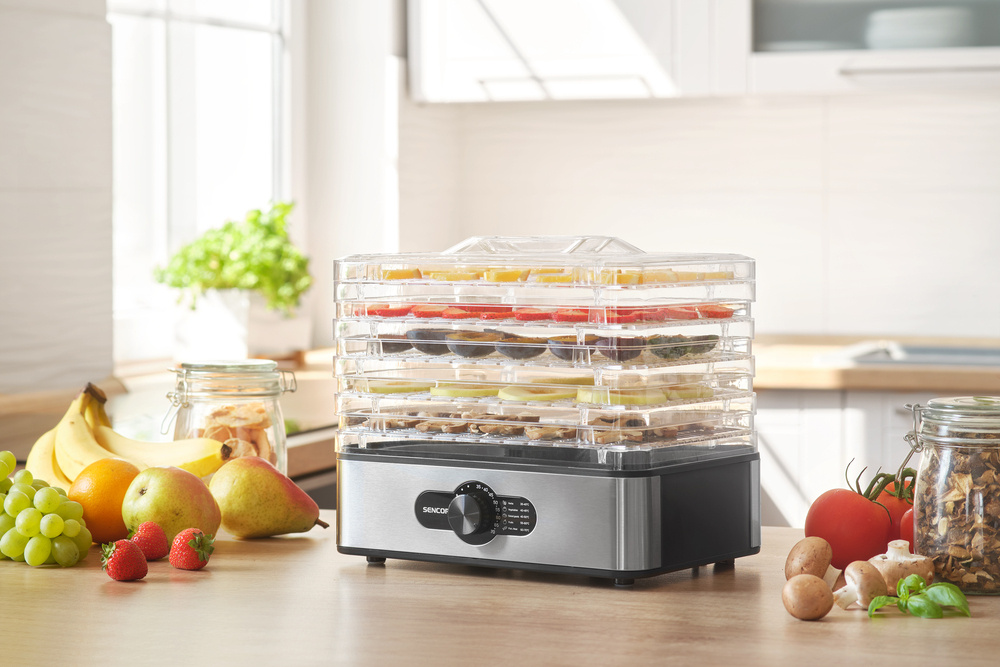Der SENCOR SFD 950SS bietet fünf hitzebeständige Kunststoffplatten mit den Maßen 29 x 20 cm. Das einzigartige Design ermöglicht es, die Höhe der Bleche je nach Art der zu trocknenden Lebensmittel auf 16 oder 29 mm einzustellen. Das integrierte Gebläse sorgt für eine optimale Zirkulation der Heißluft auf allen Etagen des Trockners, während das spezielle Design des Trocknungsblechgitters Schimmel verhindert und den Luftstrom optimiert.