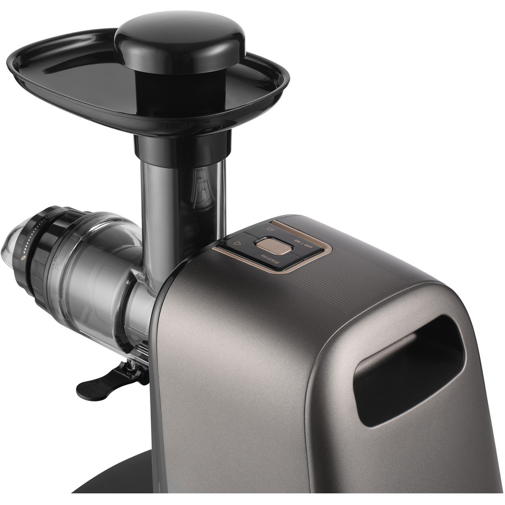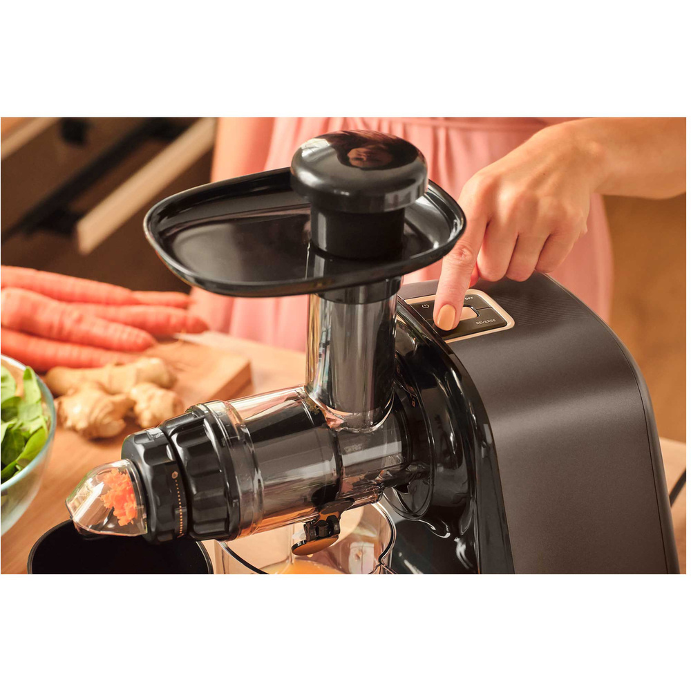 Die langlebige Entsafterschnecke, die von einem leistungsstarken 150-W-Gleichstrommotor mit extrem leisem Lauf angetrieben wird, verarbeitet selbst die härtesten Zutaten mühelos. Der SSJ 0900BK ist einer der leisesten Entsafter in seiner Kategorie. Die praktische REV-Taste schaltet den Motor in den Rückwärtsgang, um festsitzende Zutaten schnell zu lösen und einen kontinuierlichen Betriebskomfort zu gewährleisten.