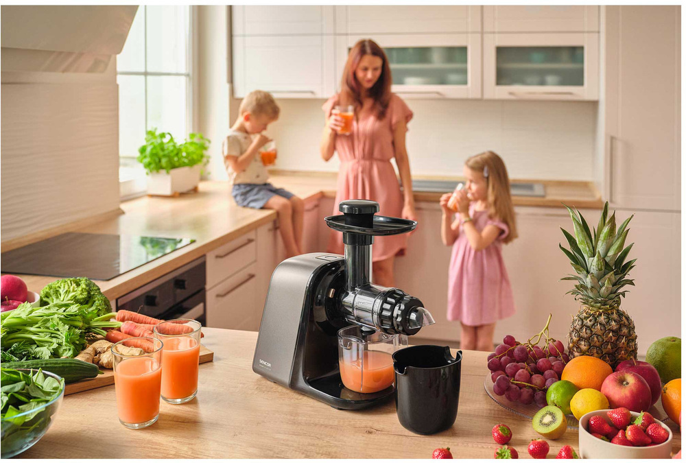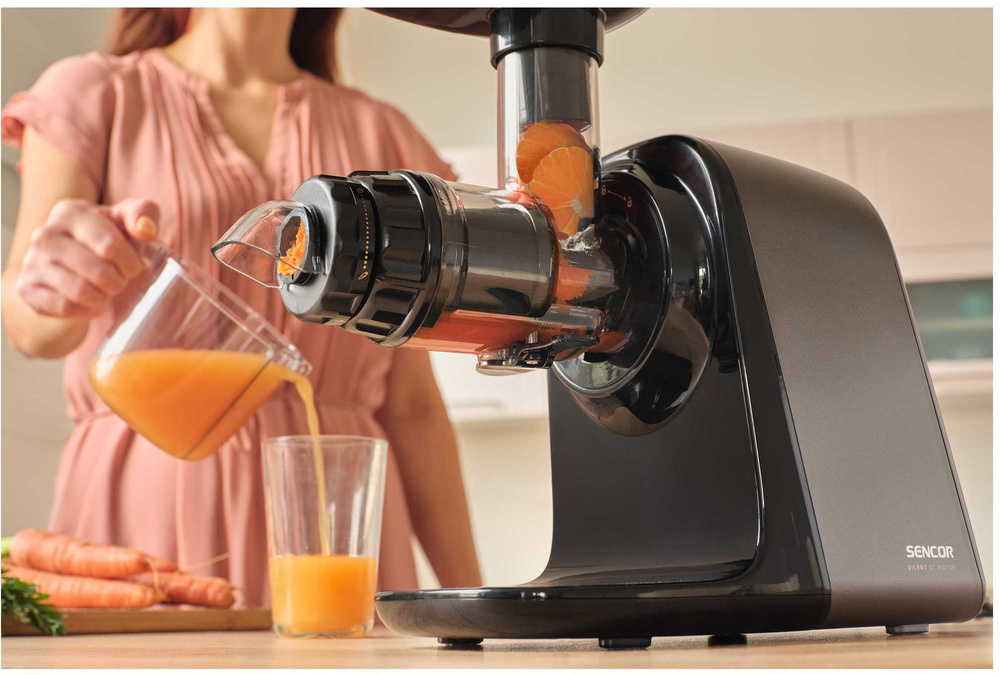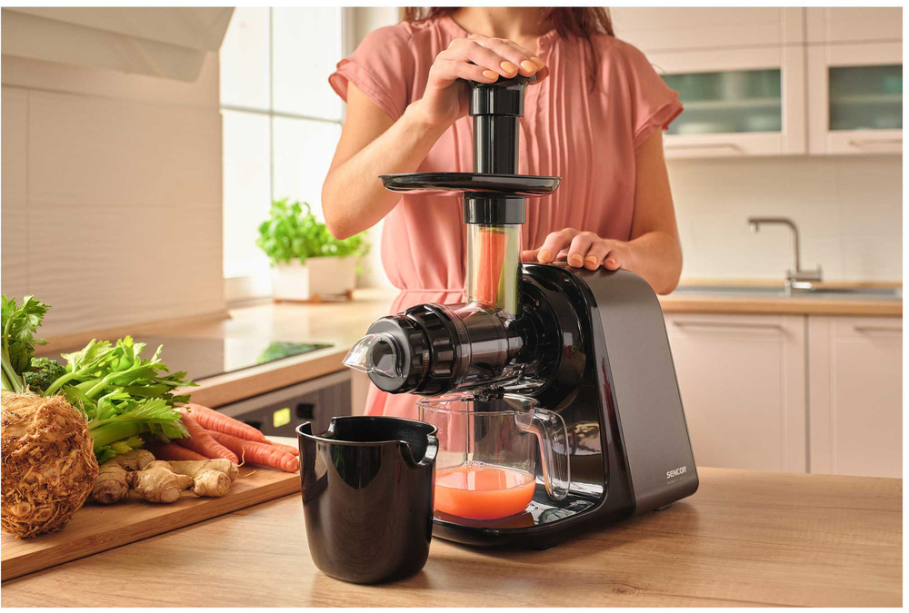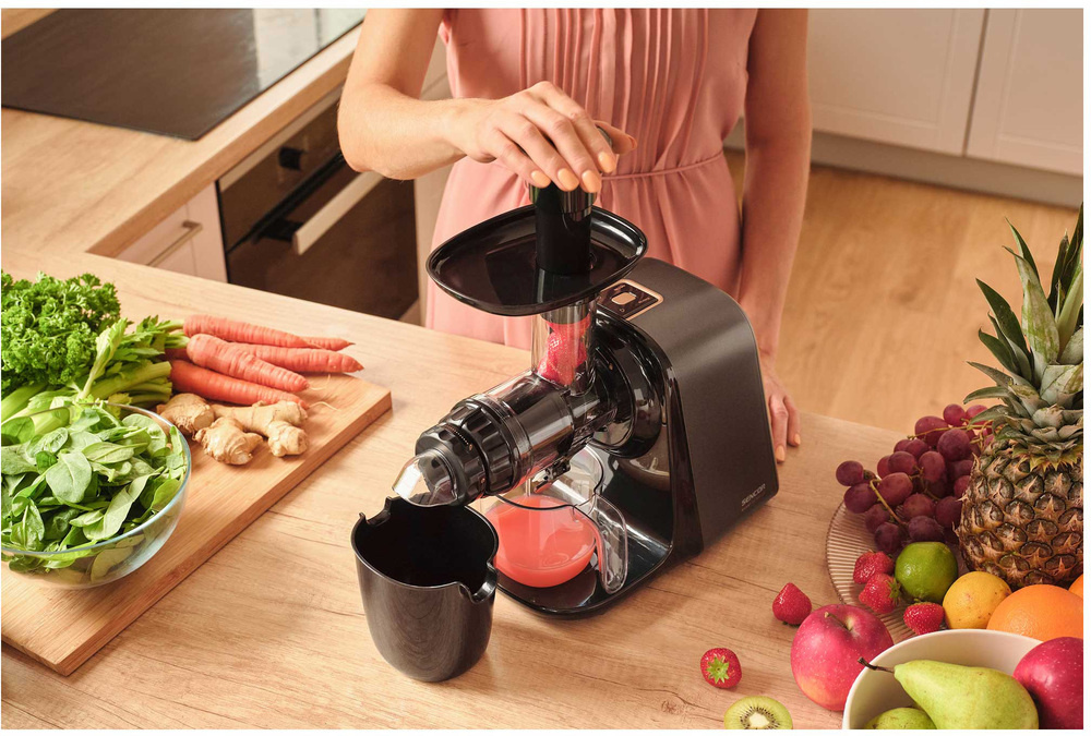 Der Schneckenentsafter SSJ 0900BK verfügt über einen revolutionären Langsamlaufmechanismus, der mit nur 65-80 Umdrehungen pro Minute arbeitet. Diese Technologie gewährleistet eine schonende Verarbeitung von Äpfeln, Zitrusfrüchten, exotischen Früchten, Johannisbeeren, Karotten und Blattgemüse. Dank der Präzisionspressung erhalten Sie frischen, vitaminreichen Saft mit minimalem Schaum und maximalem Geschmack.