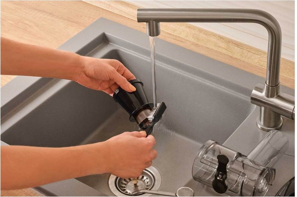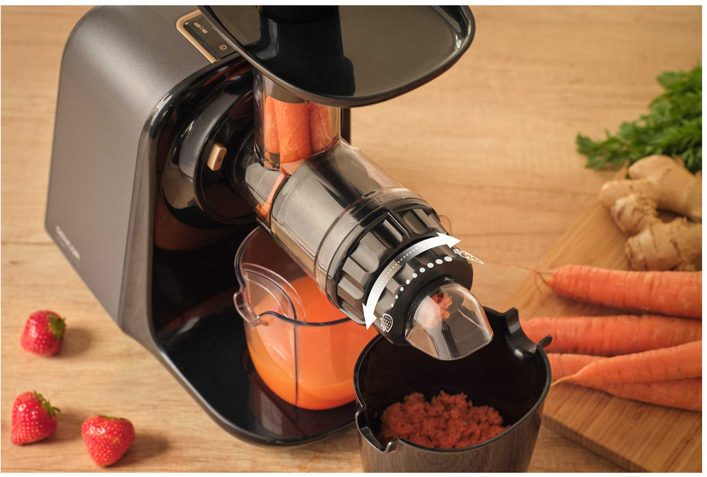 Mit dem Schnitzelregler können Sie die Restschnitzelmenge ganz einfach an die Art des Rohmaterials anpassen - von weichen Früchten bis zu hartem Gemüse. So erzielen Sie immer die ideale Ausbeute. Die Maschine verfügt über ein Antitropfsystem und Behälter mit einem Fassungsvermögen von 550 ml für Saft und 700 ml für Fruchtfleisch. Nach dem Gebraucht lassen sich die Kunststoffteile schnell zerlegen und in der Spülmaschine reinigen, inklusive praktischer Reinigungsbürste.