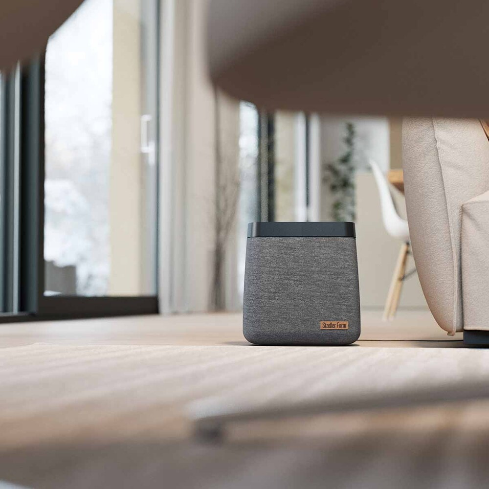 Unübersehbar, elegant, hochwertig. Das ist das Design des Luftbefeuchters Karl. Er besticht durch seine graue Textiloberfläche und das dezente Stadler Form-Logo auf dem braunen Leder. Die Bedienelemente und LED-Anzeigen sind im Inneren der Oberseite versteckt. Dadurch wird das einzigartige Design des Karl-Luftbefeuchters nicht beeinträchtigt.