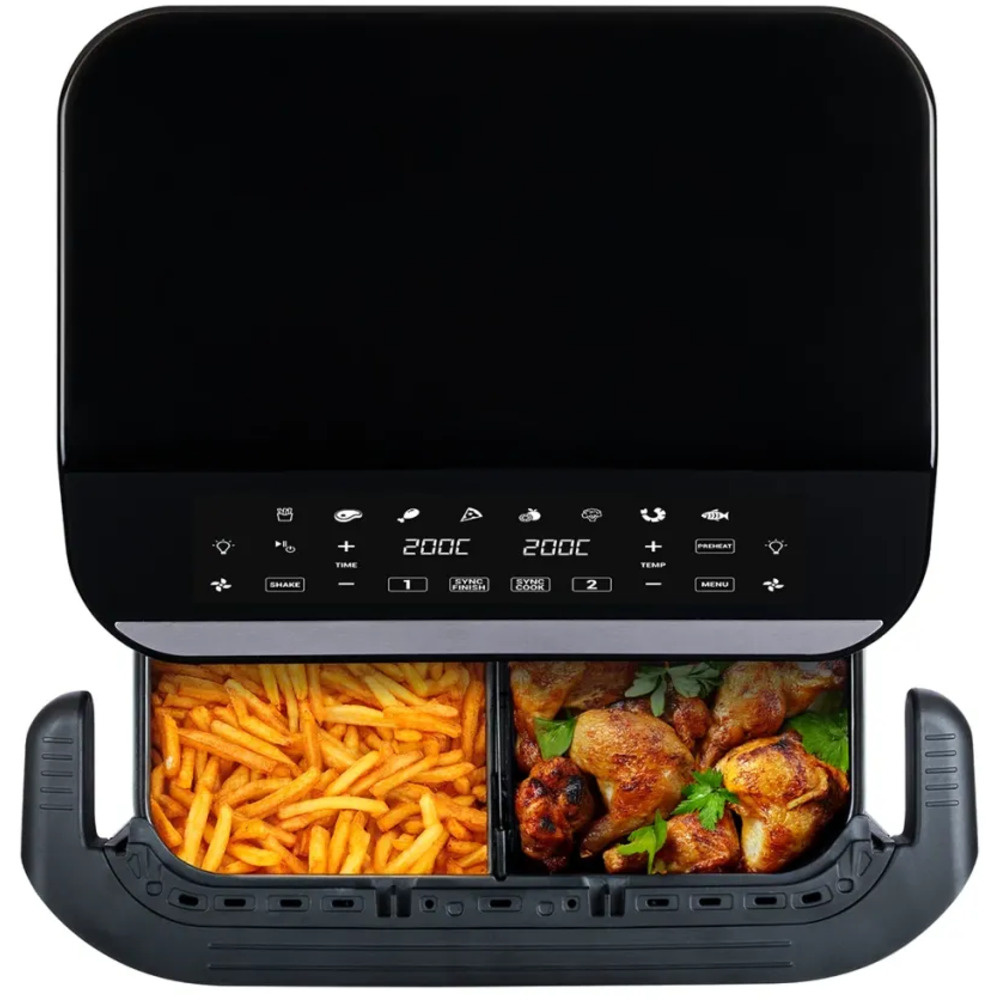 Mit Funktionen Sync-Koch a Sync-Finish haben Sie die absolute Kontrolle über Ihre Essenszubereitung. Mit Sync Cook können Sie dieselben Parameter für beide Bereiche gleichzeitig einstellen, während Sync Finish dafür sorgt, dass verschiedene Gerichte zur gleichen Zeit fertig sind. Die Fritteuse bietet temperaturbereich 80-200 °C und ein spezielles Programm Trocknung (40-80 °C). Praktische Funktion Vorwärmen und Warnung vor Schütteln sorgt bei jeder Anwendung für optimale Ergebnisse. S acht automatische Programme a 60-Minuten-Timer macht die Zubereitung eines jeden Gerichts wirklich einfach.
