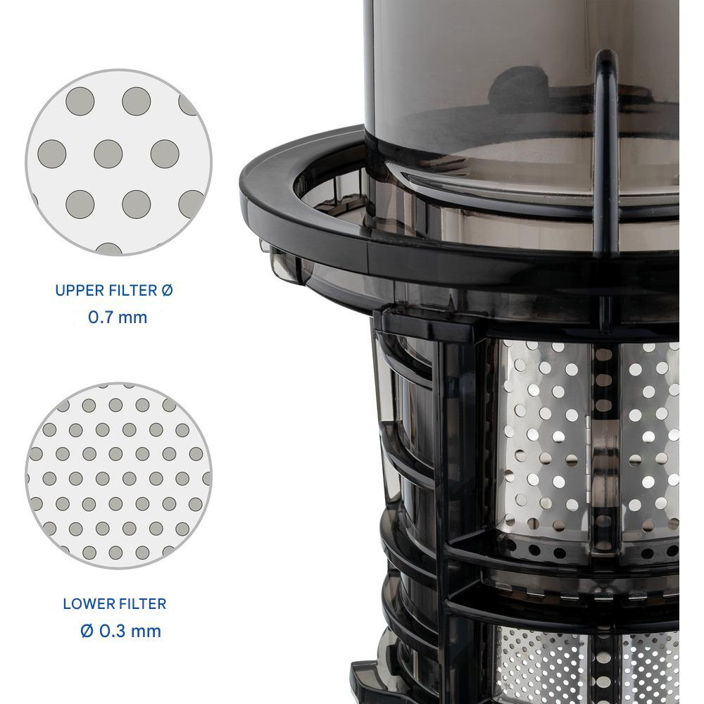Die Maschine ist mit einem zuverlässigen 200-Watt-Motor und einer robusten Pressschnecke aus sehr widerstandsfähigem Kunststoff ausgestattet, die auch härteres Rohmaterial problemlos verarbeiten kann. Der feine doppellagige Mikrofilter sorgt für eine gründliche Trennung des Fruchtfleischs und erzeugt einen weichen, delikaten Saft mit vollem und natürlichem Geschmack, der für den täglichen Verzehr geeignet ist.