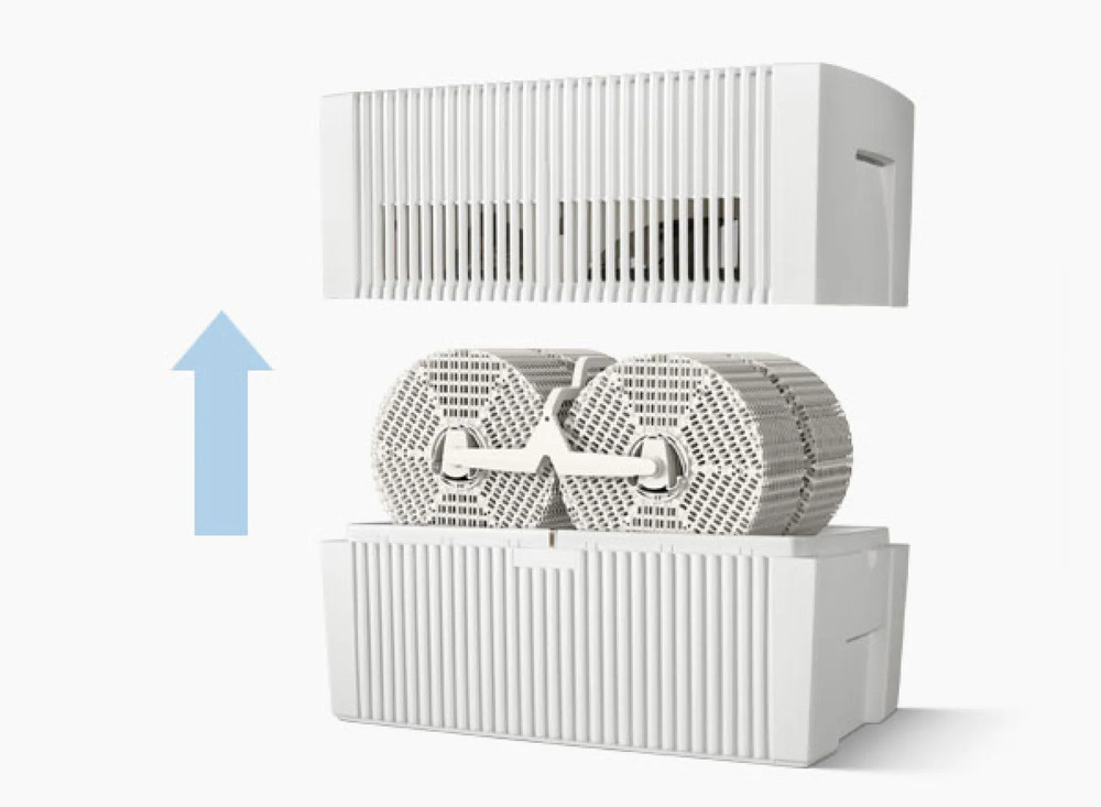 Reines Wasser verdunstet durch die in der Wasserwanne rotierenden Platten und befeuchtet die Raumluft. Diese Kaltverdunstungsmethode ist die beste und hygienischste Methode der Luftbefeuchtung und auch die natürlichste Art, Schadstoffe in der Raumluft zu reduzieren.